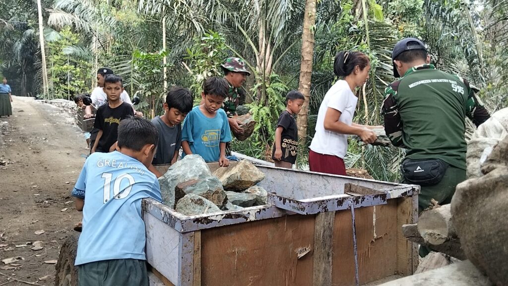 Lombok Barat, NTB – Suasana siang di Dusun Sayang, Desa Giri Madia, Kecamatan Lingsar, Lombok Barat, tampak berbeda. Beberapa anak terlihat antusias menurunkan batu dari traktor modifikasi didampingi orang tuanya. Mereka dengan penuh semangat ikut membantu anggota Satuan Tugas (Satgas) TNI Manunggal Membangun Desa (TMMD) ke-126 Komando Distrik Militer  (Kodim) 1606/Mataram yang tengah melakukan pengerjaan penaludan dan membuka akses jalan penghubung di desa mereka, Kamis (16/10/2025).