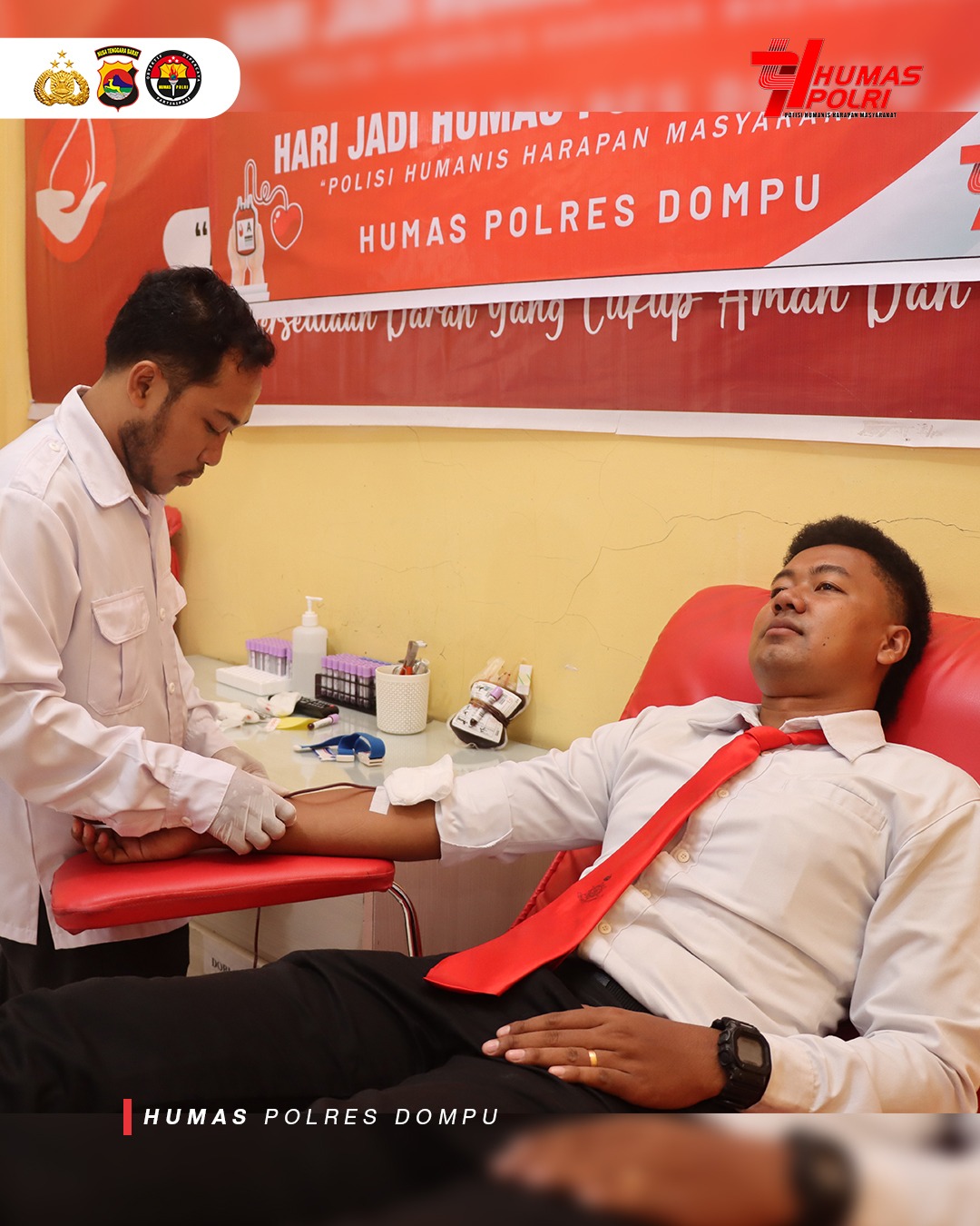 Polres Dompu melaksanakan kegiatan donor darah serentak dalam rangka memperingati Hari Jadi ke-74 Humas Polri Tahun 2025 dengan mengusung tema “Polisi Humanis Harapan Masyarakat”
