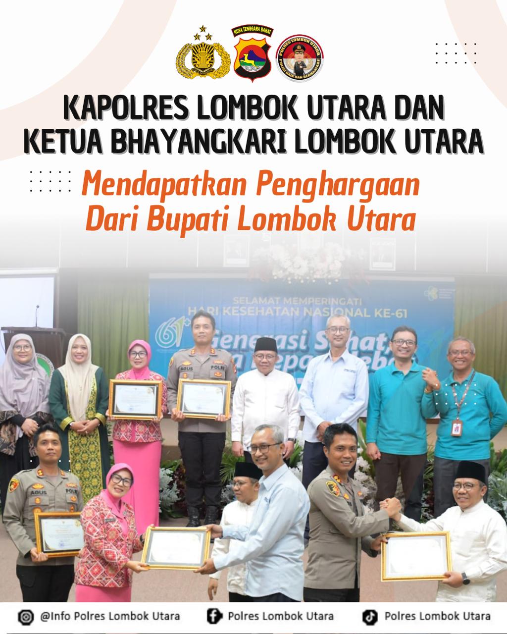 Sebagai bentuk apresiasi, pada kesempatan tersebut Bupati Lombok Utara memberikan penghargaan kepada Kapolres Lombok Utara AKBP Agus Purwanta, S.I.K. dan Ketua Bhayangkari Cabang Lombok Utara Ny. Henny Agus Purwanta atas dedikasinya dalam mendukung program pelayanan kesehatan masyarakat di Lombok Utara.