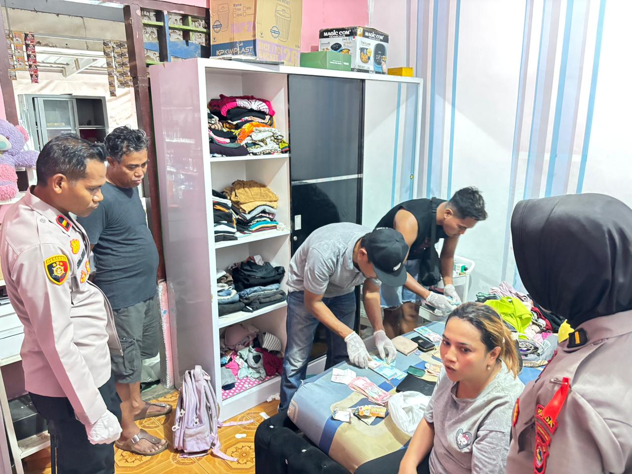 Dalam proses penggerebekan, petugas terlebih dahulu menghadirkan saksi umum setempat untuk menyaksikan penggeledahan badan dan rumah terduga pelaku. Dari hasil penggeledahan, petugas menemukan 7 (tujuh) bungkus plastik klip berisi kristal narkotika jenis sabu, yang terdiri dari 6 (enam) bungkus disimpan dalam plastik warna putih dan 1 (satu) bungkus disimpan di dalam dompet kecil.