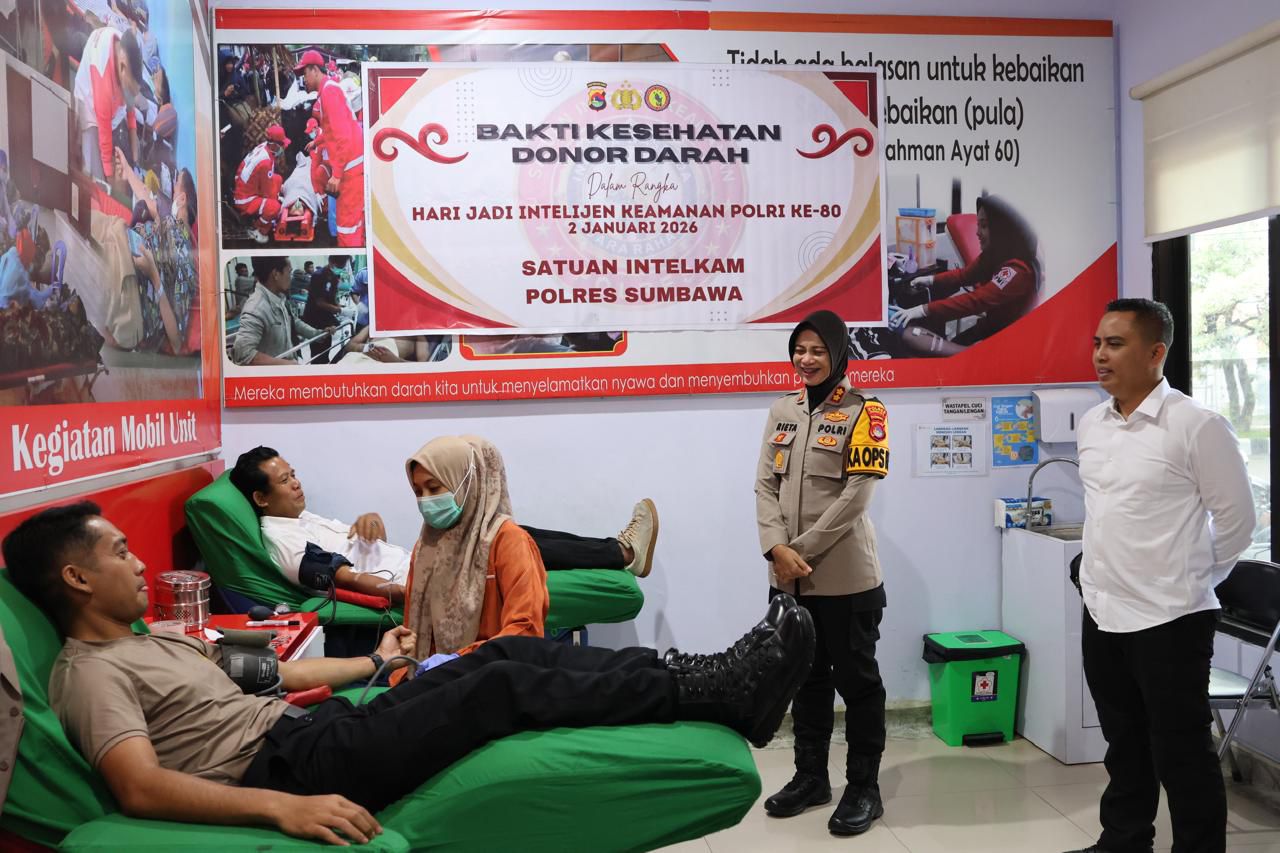 “Selamat Hari Jadi Intelkam Polri ke-80. Semoga kegiatan donor darah ini menjadi ladang amal dan bermanfaat bagi stok darah di PMI Sumbawa untuk masyarakat yang membutuhkan. Saya berharap seluruh rangkaian kegiatan ini dilaksanakan dengan maksimal sebagai wujud pengabdian kita,” ungkap Kapolres.