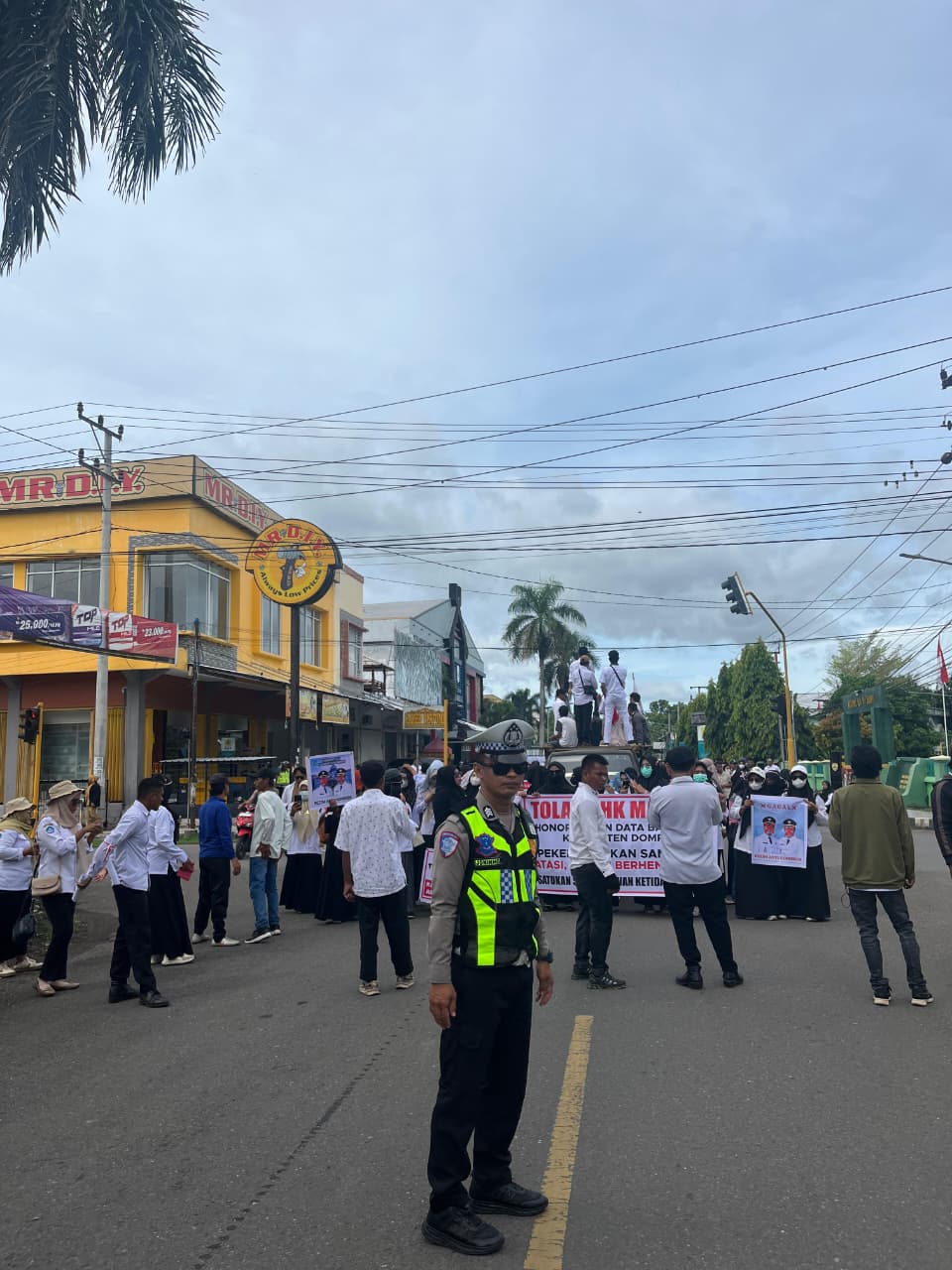 Satuan Lalu Lintas (Sat Lantas) Polres Dompu melaksanakan kegiatan pengamanan, pengawalan, serta pengaturan arus lalu lintas dalam rangka aksi unjuk rasa yang dilakukan oleh Aliansi Honorer Non-Database BKN Gagal CPNS Kabupaten Dompu.