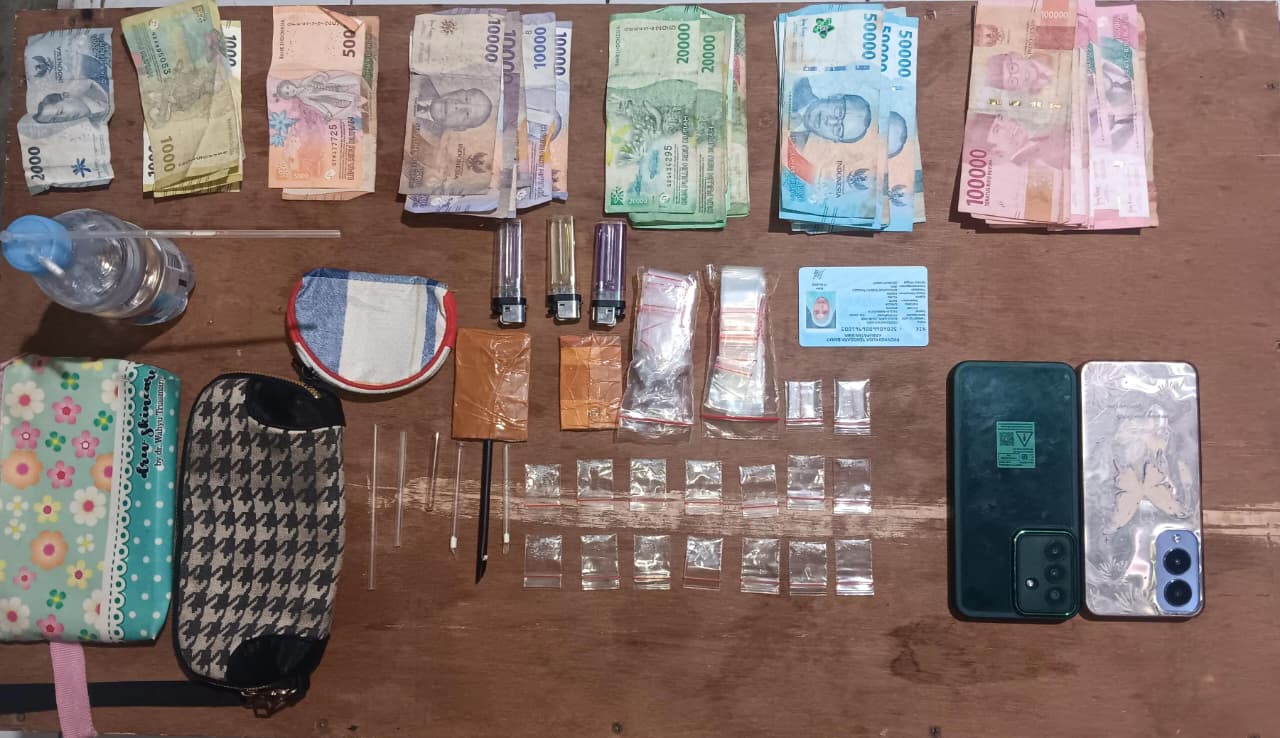 Dari tangan terduga pelaku, petugas mengamankan sejumlah barang bukti berupa 16 bungkus plastik klip berisi kristal diduga sabu dengan berat kotor 2,29 gram dan berat netto 0,29 gram, dua bungkus plastik klip kosong, tiga korek api, satu kaca, lima sendok pipet, satu KTP, satu unit handphone Samsung A17, satu unit handphone Vivo Y17, dua dompet, satu alat hisap bong, serta uang tunai sebesar Rp1.338.000 yang diduga hasil penjualan.