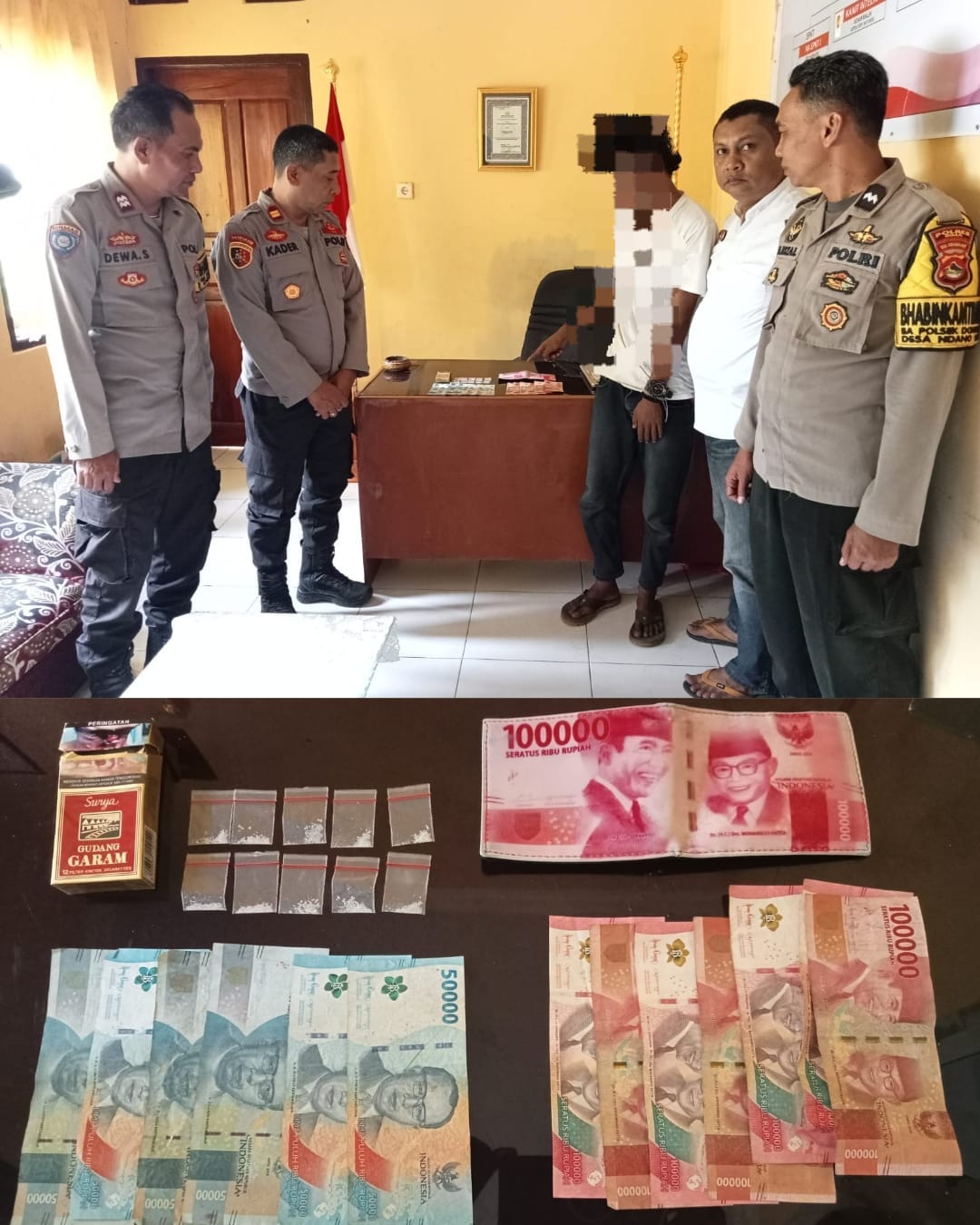 Saat dilakukan penangkapan terduga pelaku tidak dapat berkilah pasal saat rumahnya di geledah oleh petugas yang juga ikut disaksikan oleh warga sekitar itu petugas berhasil menyita 10 pocket kristal putih yang diduga kuat Narkoba Jenis Shabu siap edar.