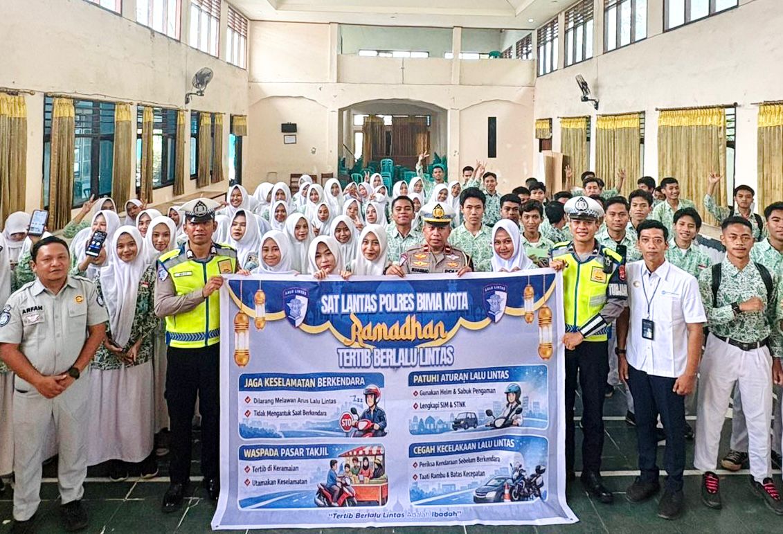 Kota Bima, NTB (25 Februari 2026) – Dalam rangka meningkatkan kesadaran dan kedisiplinan berlalu lintas selama bulan suci Ramadan 1447 H, Satuan Lalu Lintas Polres Bima Kota melaksanakan kegiatan Police Go To School dengan tema “Ramadhan Tertib Berlalu Lintas” di SMA Negeri 1 Kota Bima, Rabu (25/02/2026) pukul 08.30 WITA.