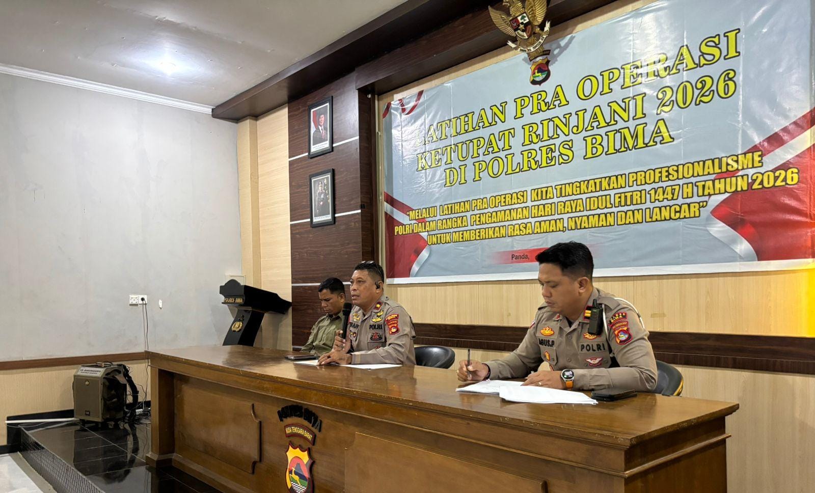 Kamis 12 Maret 2026 Polres Bima Kabupaten jajaran Polda NTB menggelar Latihan Pra Operasi (Lat Pra Ops) Ketupat Rinjani 2026 dalam rangka mengamankan arus mudik lebaran 2026 bertempat di Aula Mapolres Bima Kabupaten.