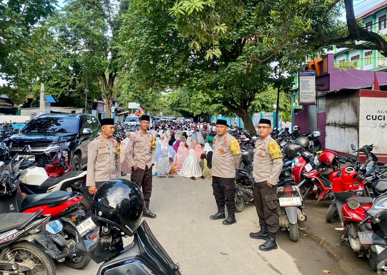 Selain melakukan pengamanan di lokasi pelaksanaan sholat, personel juga turut mengatur arus lalu lintas serta memberikan imbauan kepada masyarakat agar tetap menjaga ketertiban selama kegiatan berlangsung.