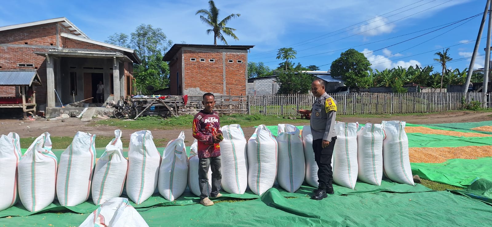 Dalam rangka mendukung Program Ketahanan Pangan Nasional menuju Indonesia Emas 2045, Bhabinkamtibmas (BKTM) Desa Tolokalo, Polsek Kempo, melaksanakan kegiatan pemantauan hasil panen jagung milik warga binaan yang sedang dijemur dan dikemas untuk didistribusikan ke gudang Bulog.