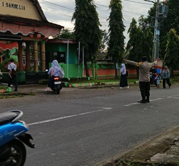 Personel Polsek Sambelia Laksanakan Pengaturan Lalu Lintas Pagi di Depan SMPN 1 Sambelia