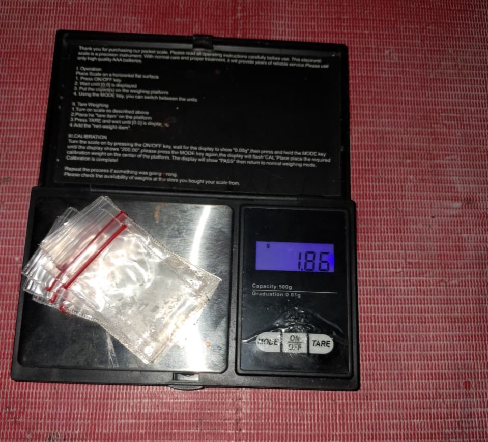 Dalam proses penggeledahan yang disaksikan oleh warga setempat, petugas menemukan sejumlah barang bukti. Di antaranya 8 (delapan) bungkus plastik klip berisi kristal diduga narkotika jenis sabu dengan berat bruto 1,86 gram yang disimpan di atas atap pembatas kos dalam sebuah kotak rokok.