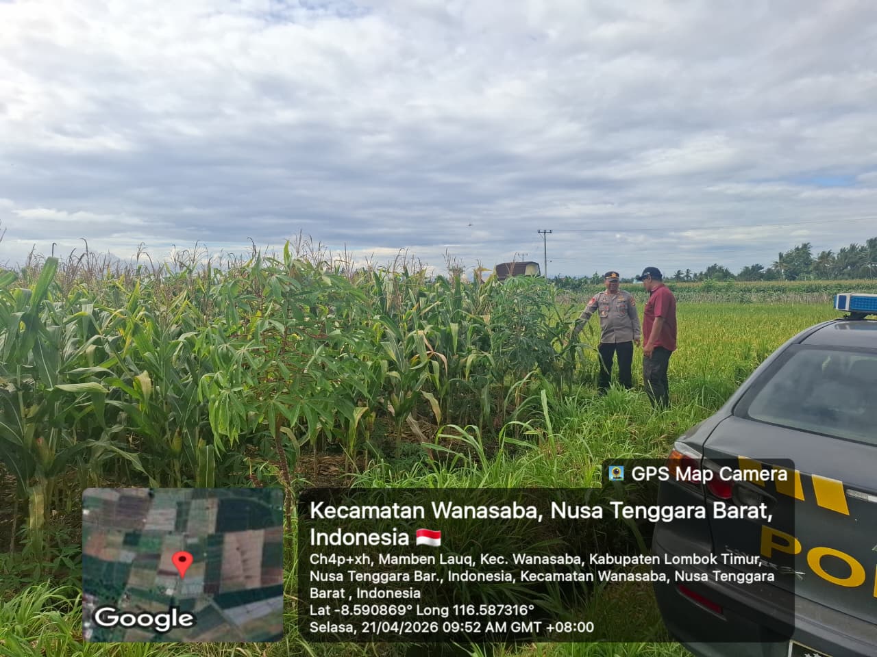 Lombok Timur — Kapolsek Wanasaba, Iptu Lalu Muhammad Ihsan, bersama satu personel Polsek Wanasaba Polres Lombok Timur melaksanakan kegiatan pengecekan lokasi lahan penanaman jagung pada Selasa (21/4/2026) pukul 09.30 WITA hingga selesai. Kegiatan ini turut melibatkan Koordinator PPL UPTP Pertanian, PPL Desa Bandok, serta PPL Desa Mamben Baru.