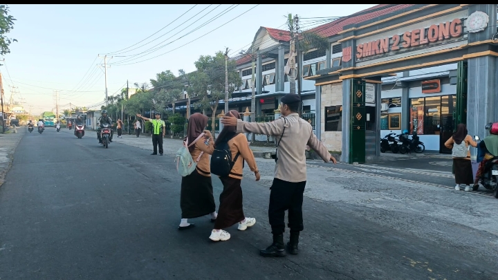 Tidak hanya melakukan pengaturan, personel juga memberikan imbauan kepada siswa-siswi serta para pengguna jalan untuk selalu mematuhi peraturan lalu lintas, terutama pentingnya penggunaan helm saat berkendara sepeda motor sebagai bentuk perlindungan diri di jalan raya.