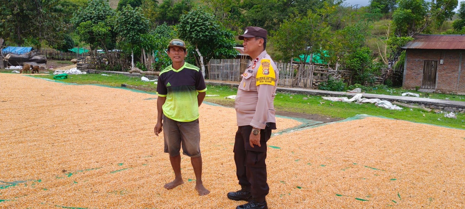 Dalam rangka mendukung Program Ketahanan Pangan Nasional menuju Indonesia Emas 2045, Bhabinkamtibmas Desa Kramat Polsek Kilo melaksanakan kegiatan pemantauan terhadap warga binaan yang sedang melakukan penjemuran hasil panen jagung.